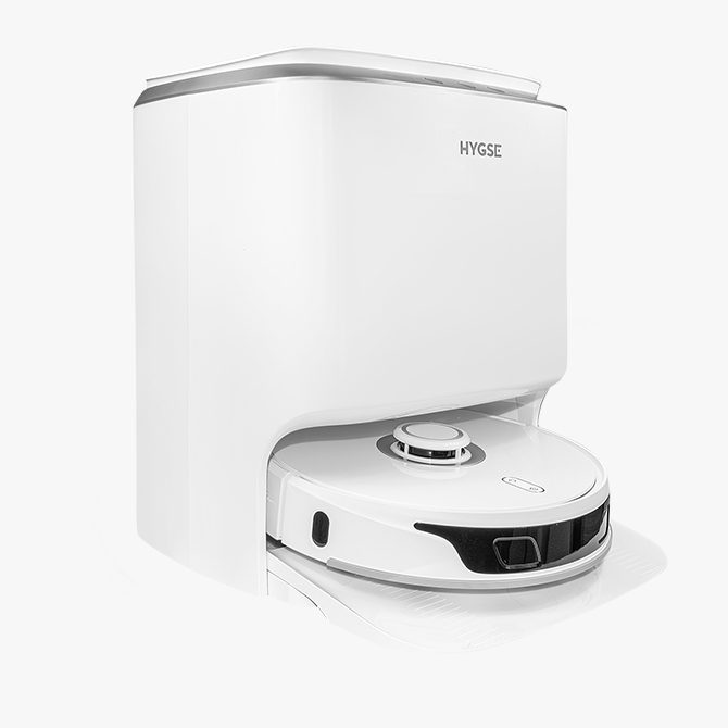 Po zakończeniu pracy HYGSE Smart 2 wraca do stacji dokującej, gdzie automatycznie myje swoje pady mopujące, suszy je gorącym powietrzem i sterylizuje wodę, eliminując 99,9% bakterii.